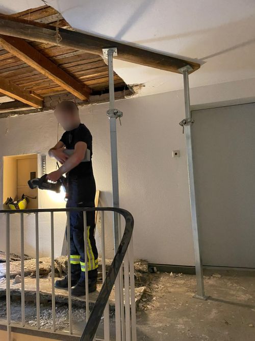 Am späten Abend wurde unser Rüstwagen von der Berufsfeuerwehr nachgefordert, da das vorhandene Material nicht ausreichte, um eine  Decke abzustützen.
